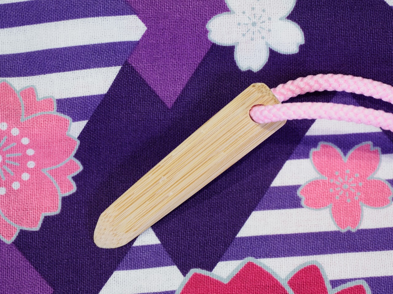 笛袋全体を紐で巻き、笹止めをさして止めます。