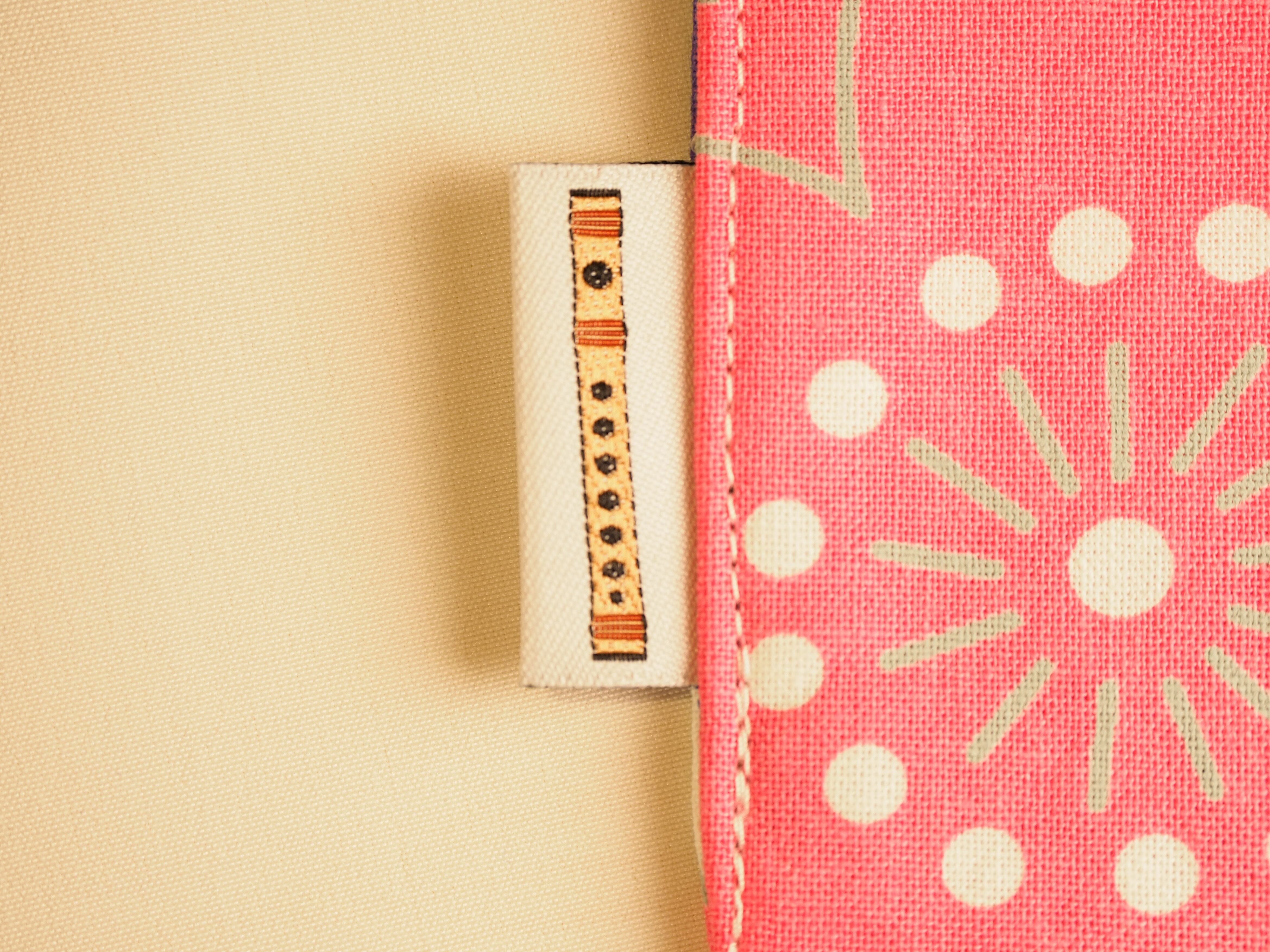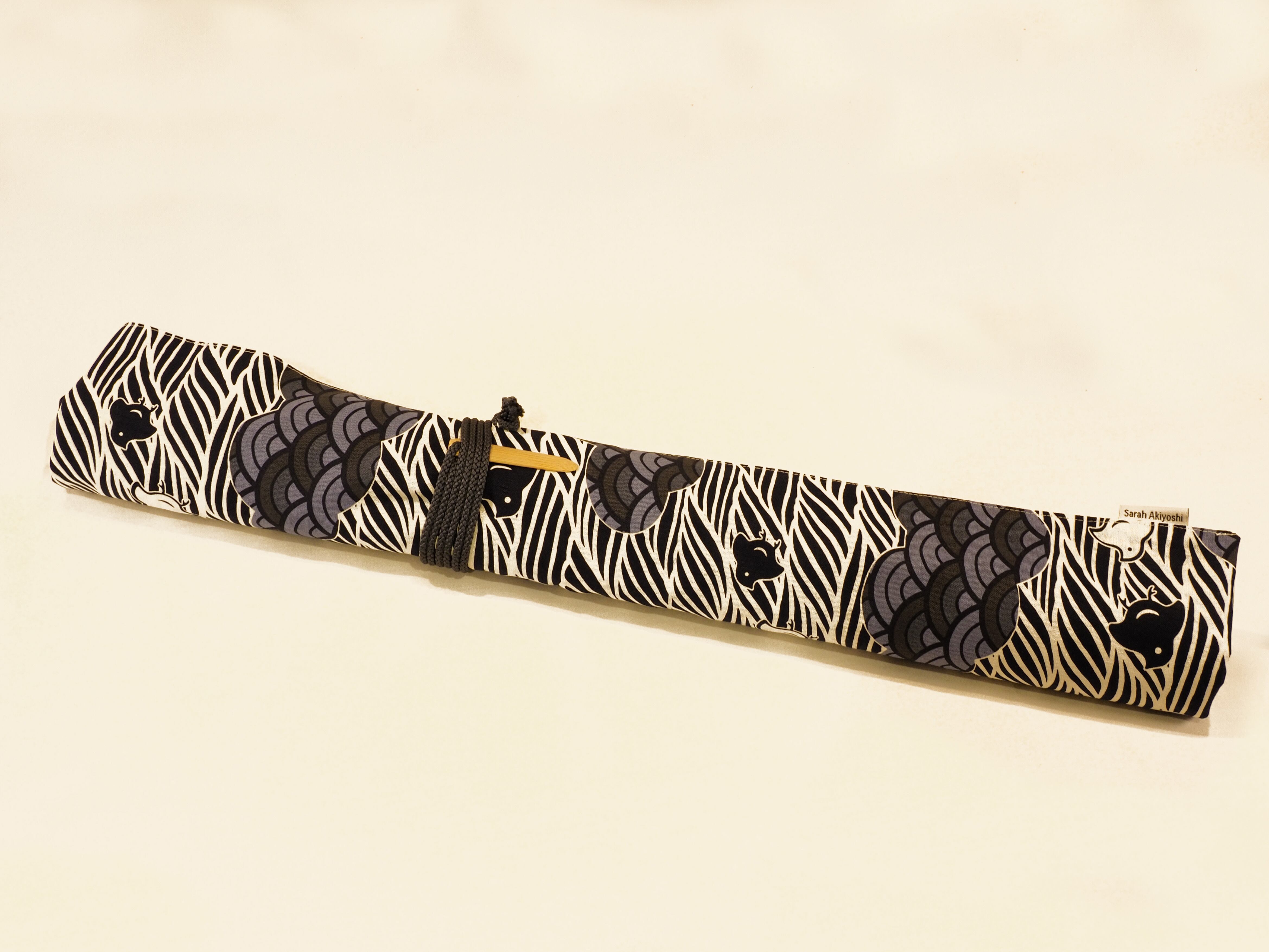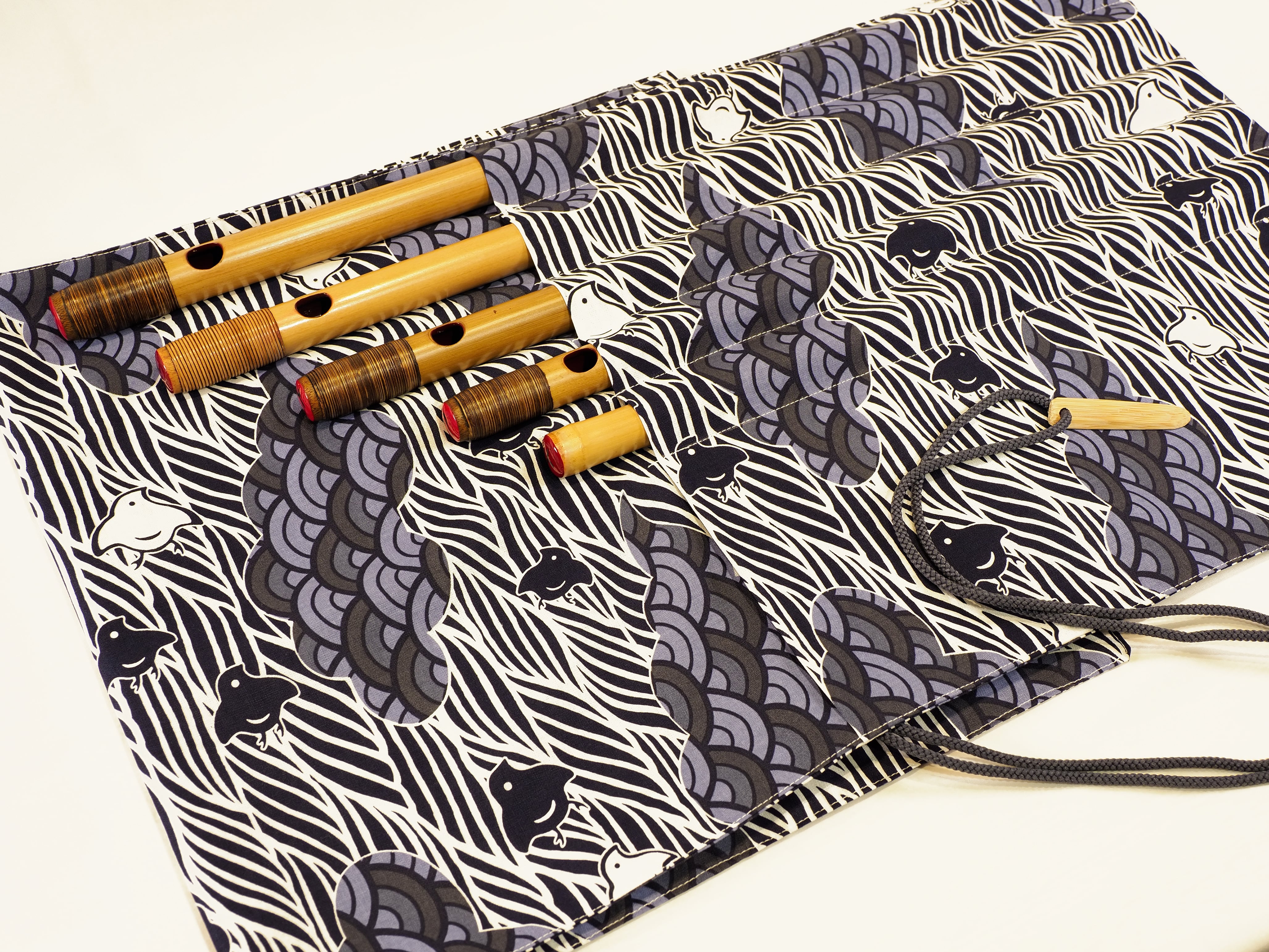 この笛袋の設計は秋吉沙羅が高校生の頃、頭の中にふとひらめいたもので、以来このオリジナルの形を自作で使い続けています。