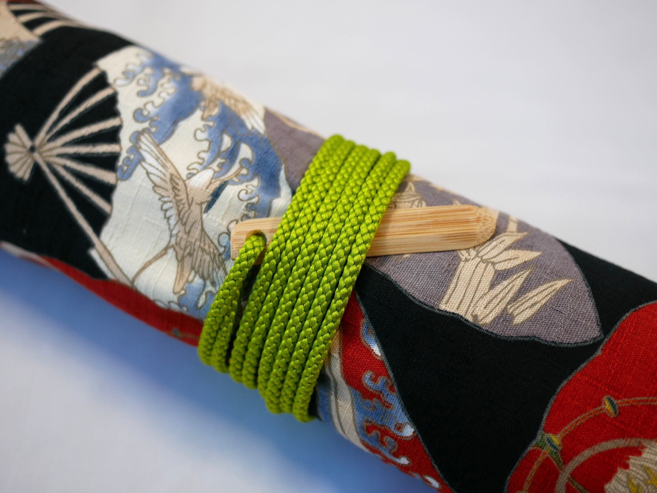 笛袋全体を紐で巻き、笹止めをさして止めます。