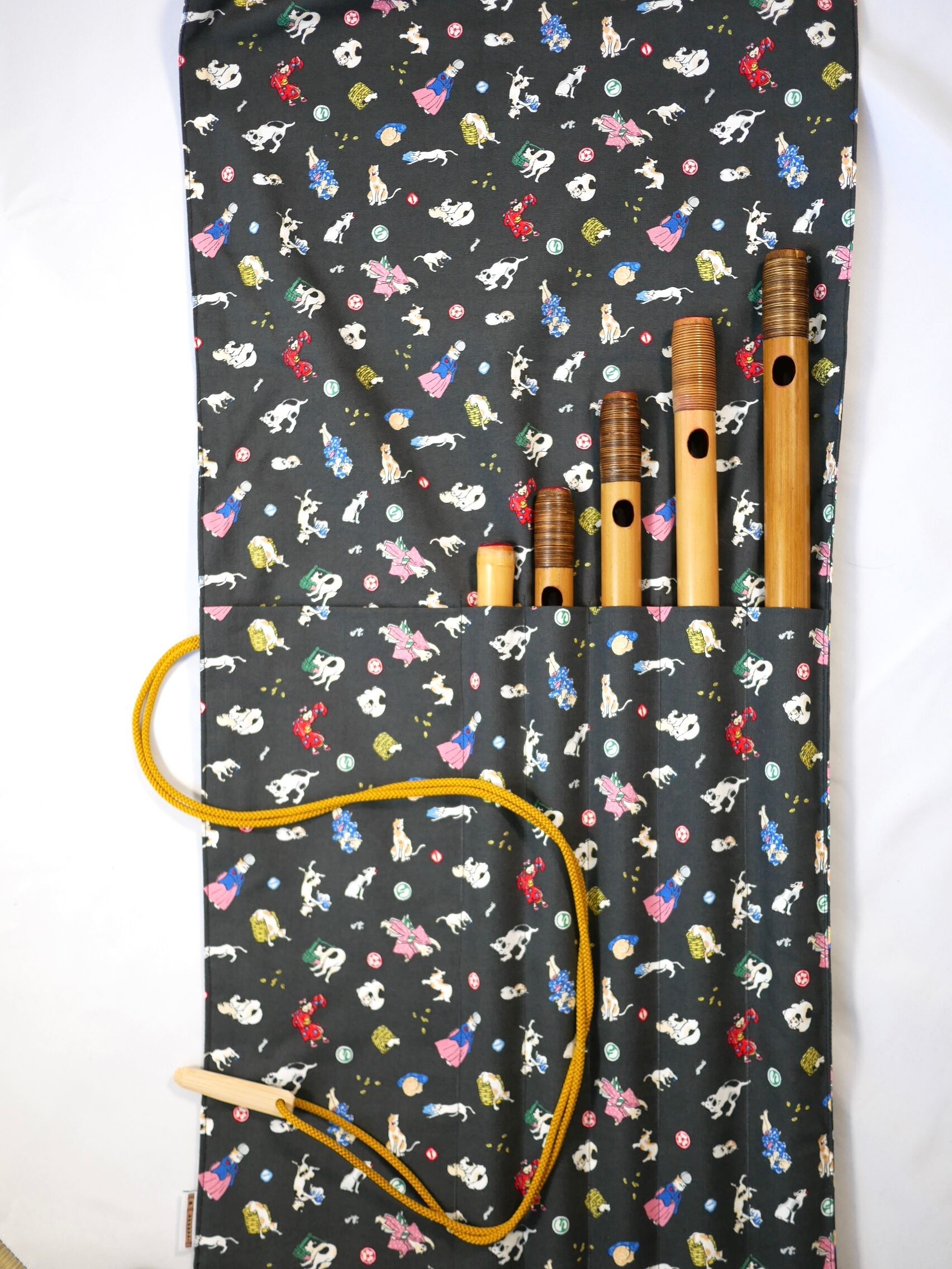 この笛袋の設計は秋吉沙羅が高校生の頃、頭の中にふとひらめいたもので、以来このオリジナルの形を自作で使い続けています。