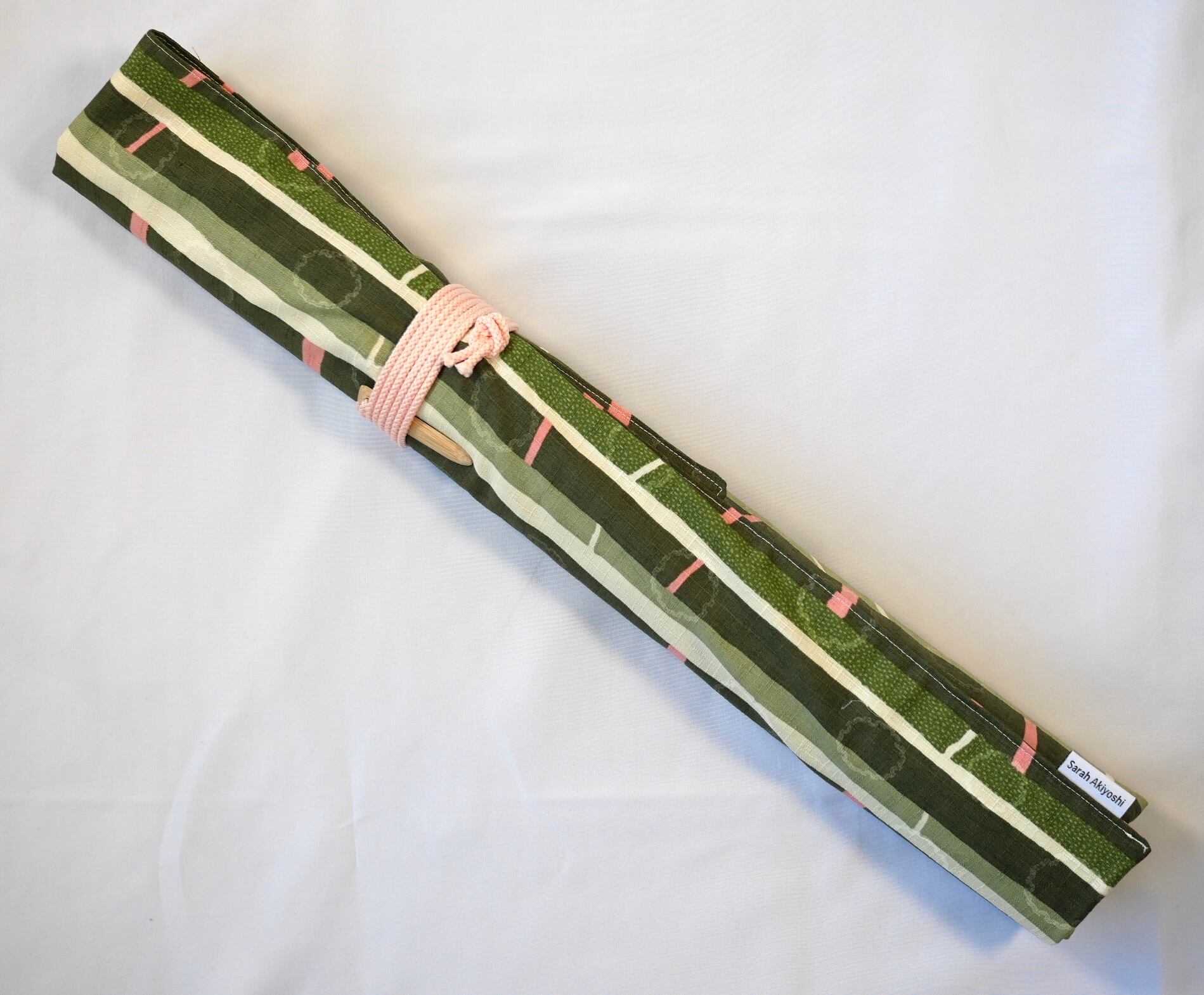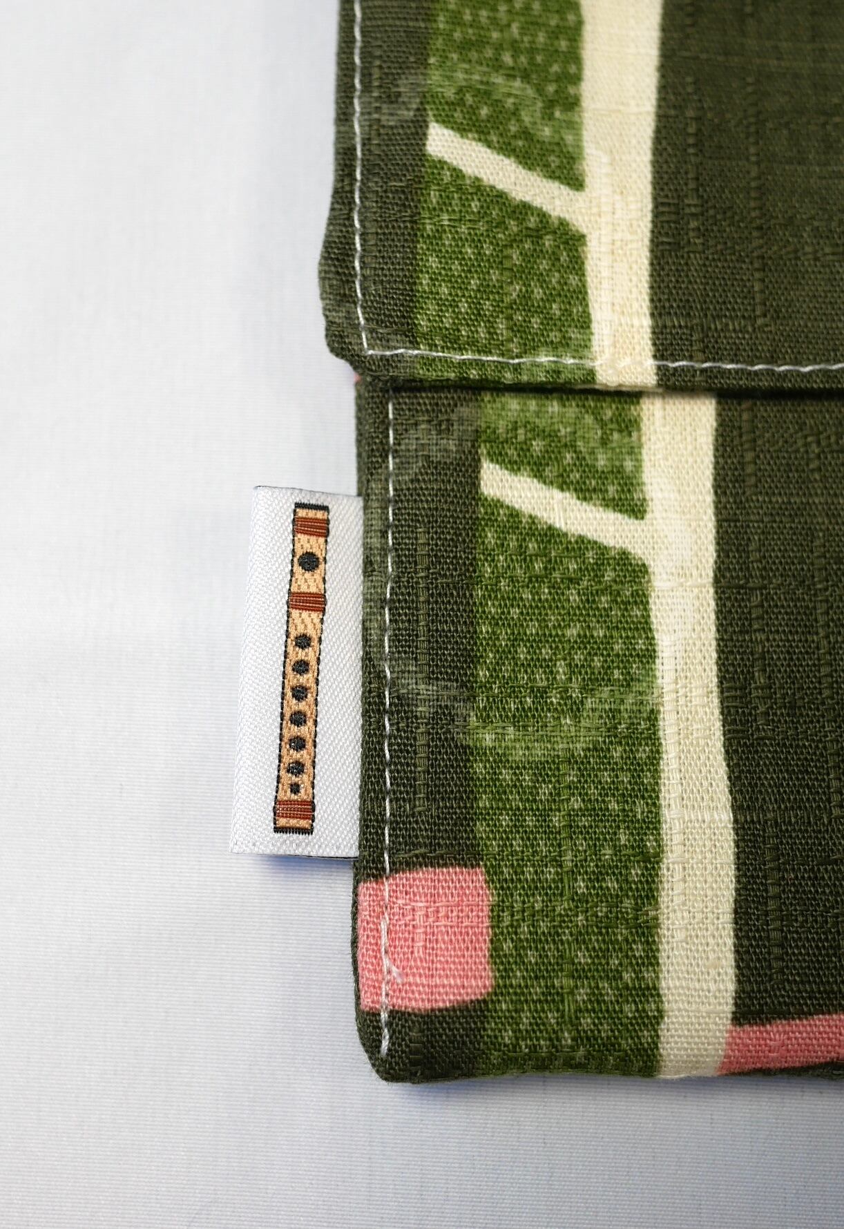 この笛袋の設計は秋吉沙羅が高校生の頃、頭の中にふとひらめいたもので、以来このオリジナルの形を自作で使い続けています。