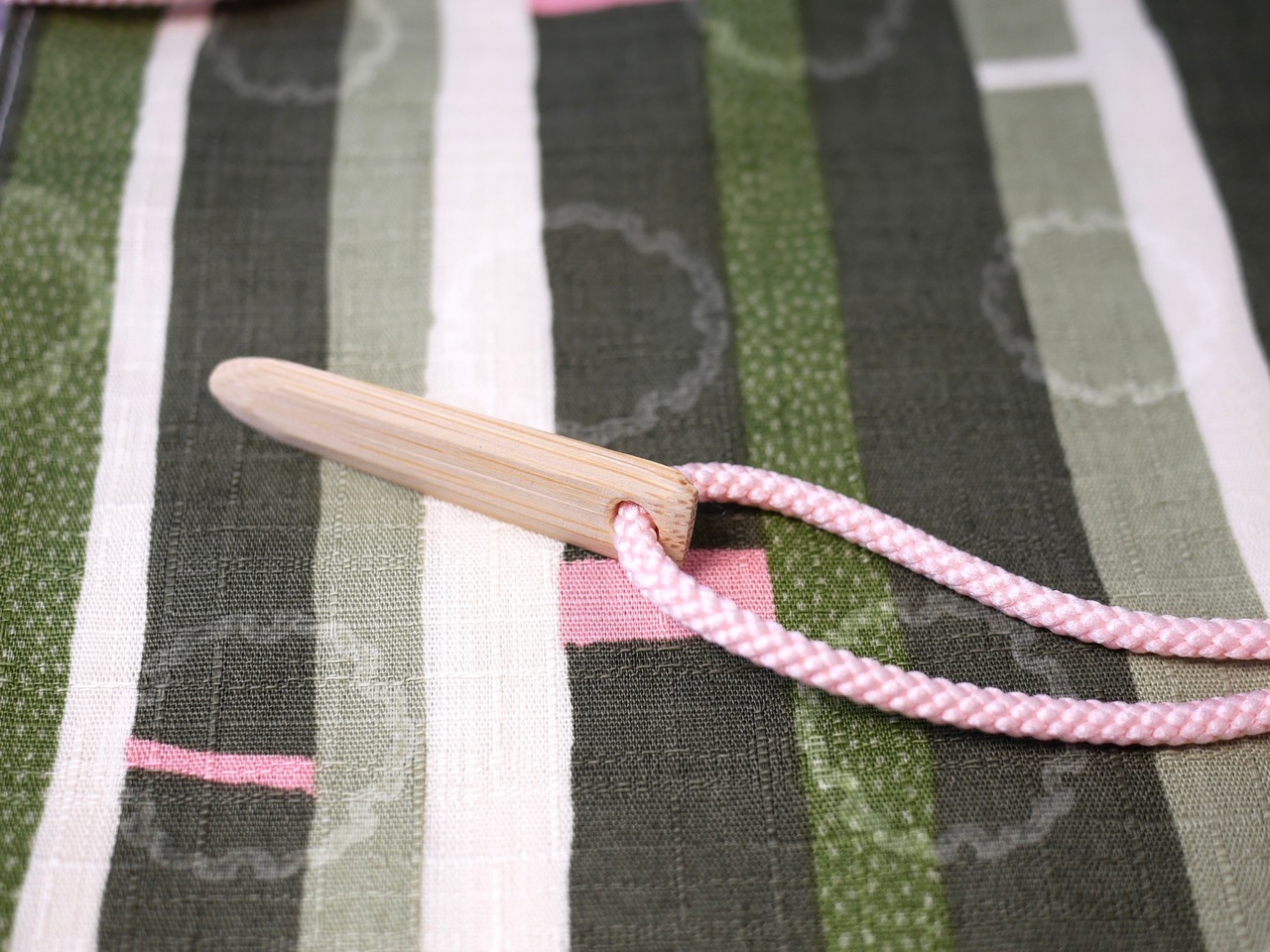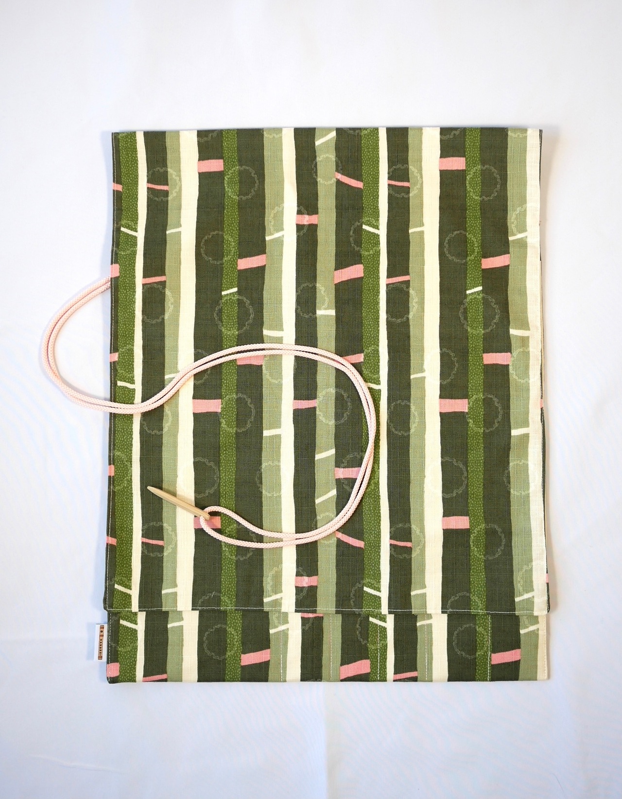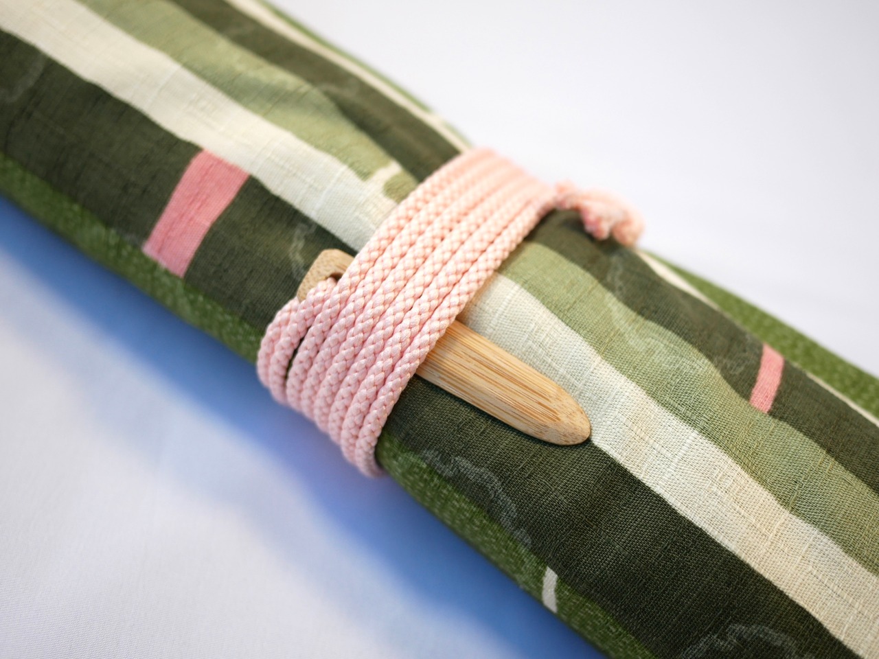 笛袋全体を紐で巻き、笹止めをさして止めます。