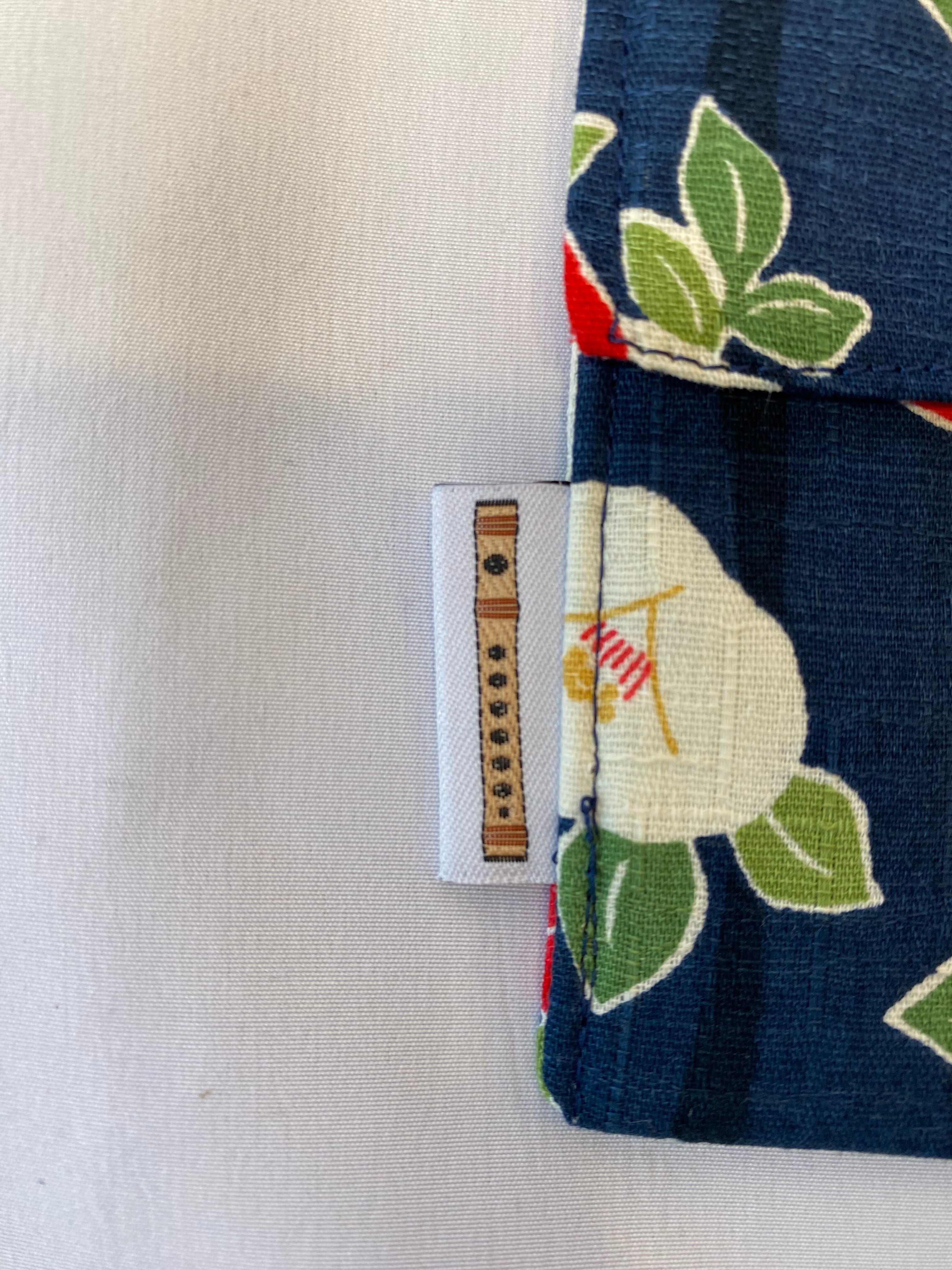 この笛袋の設計は秋吉沙羅が高校生の頃、頭の中にふとひらめいたもので、以来このオリジナルの形を自作で使い続けています。