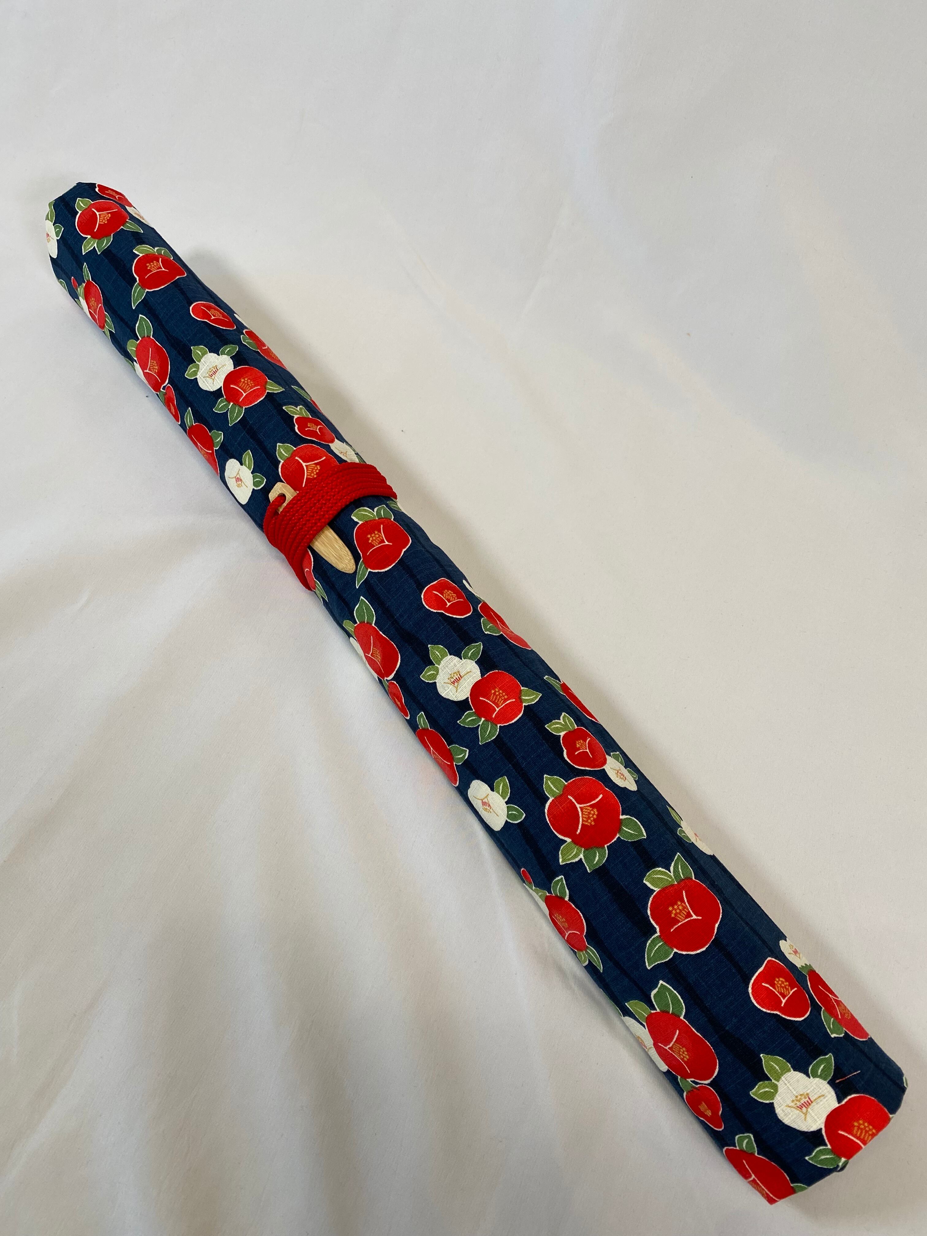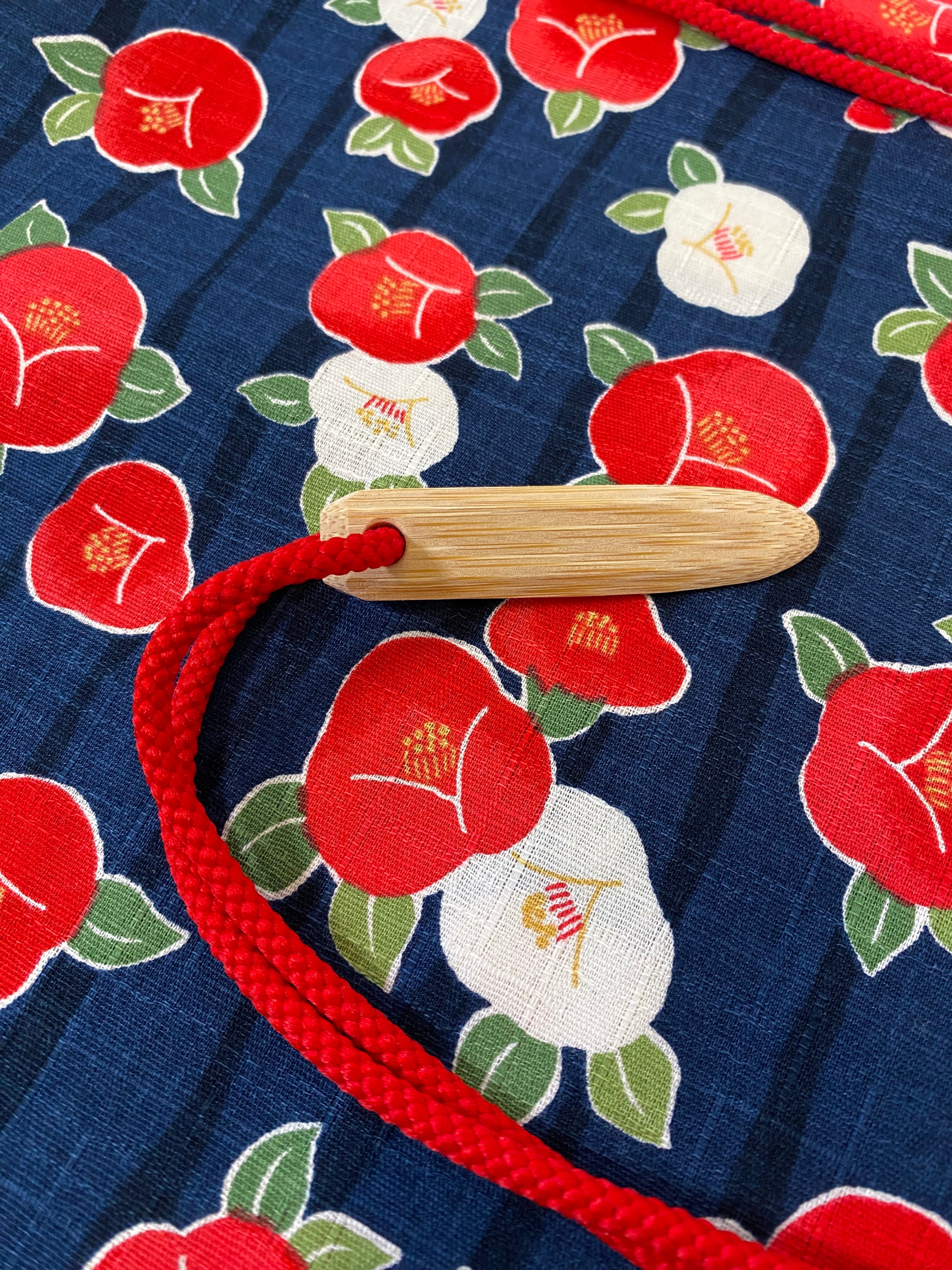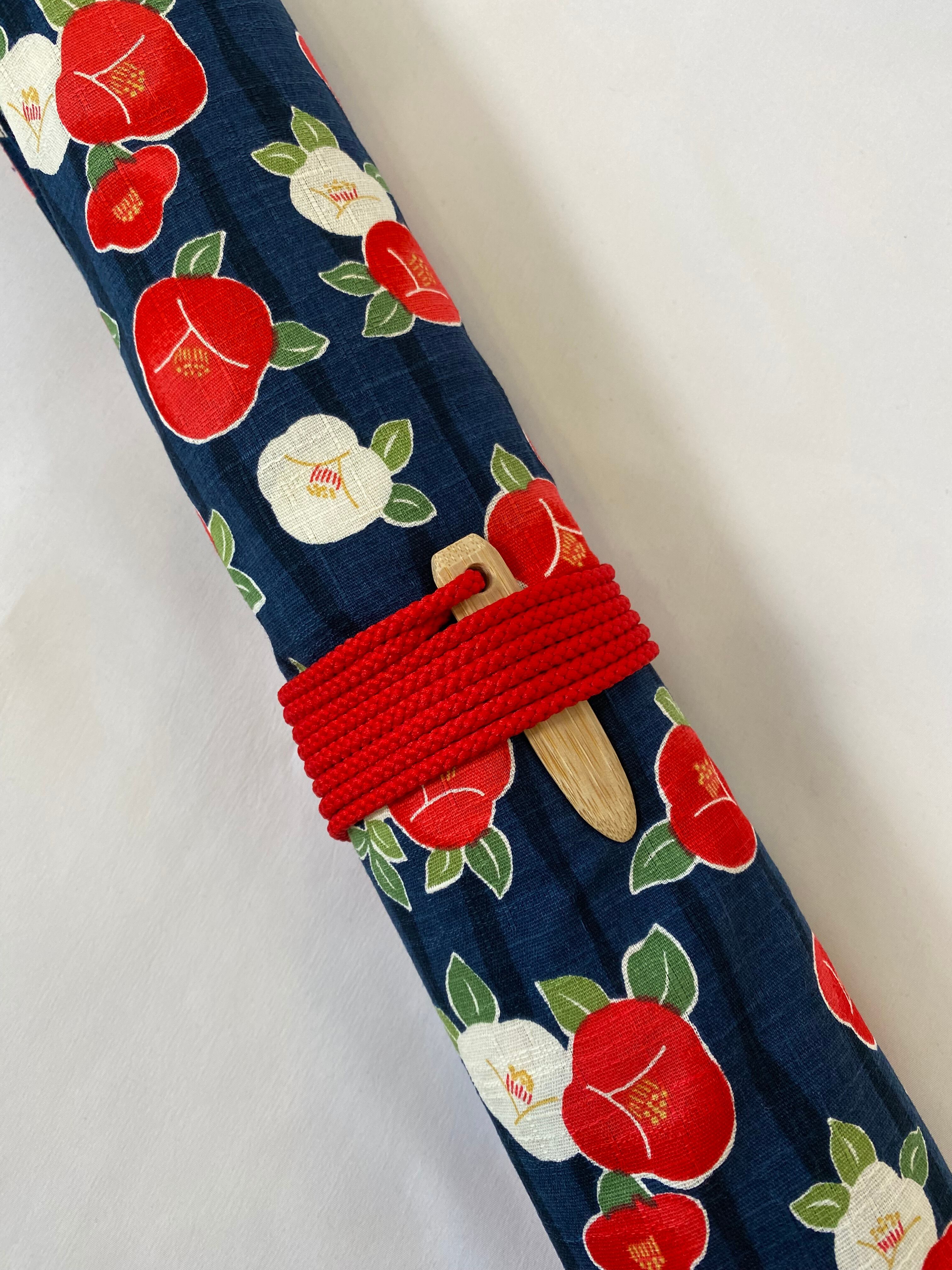 笛袋全体を紐で巻き、笹止めをさして止めます。