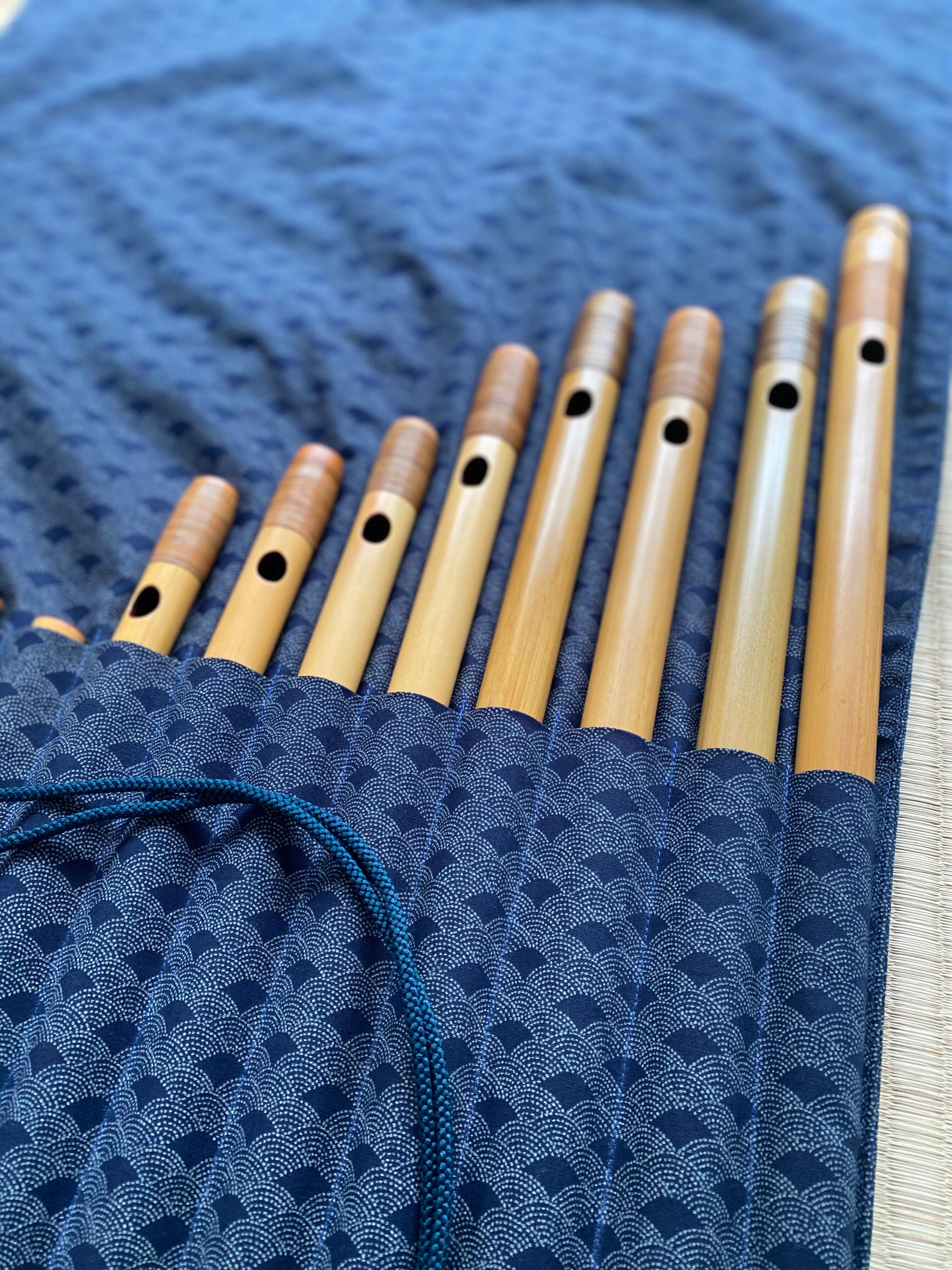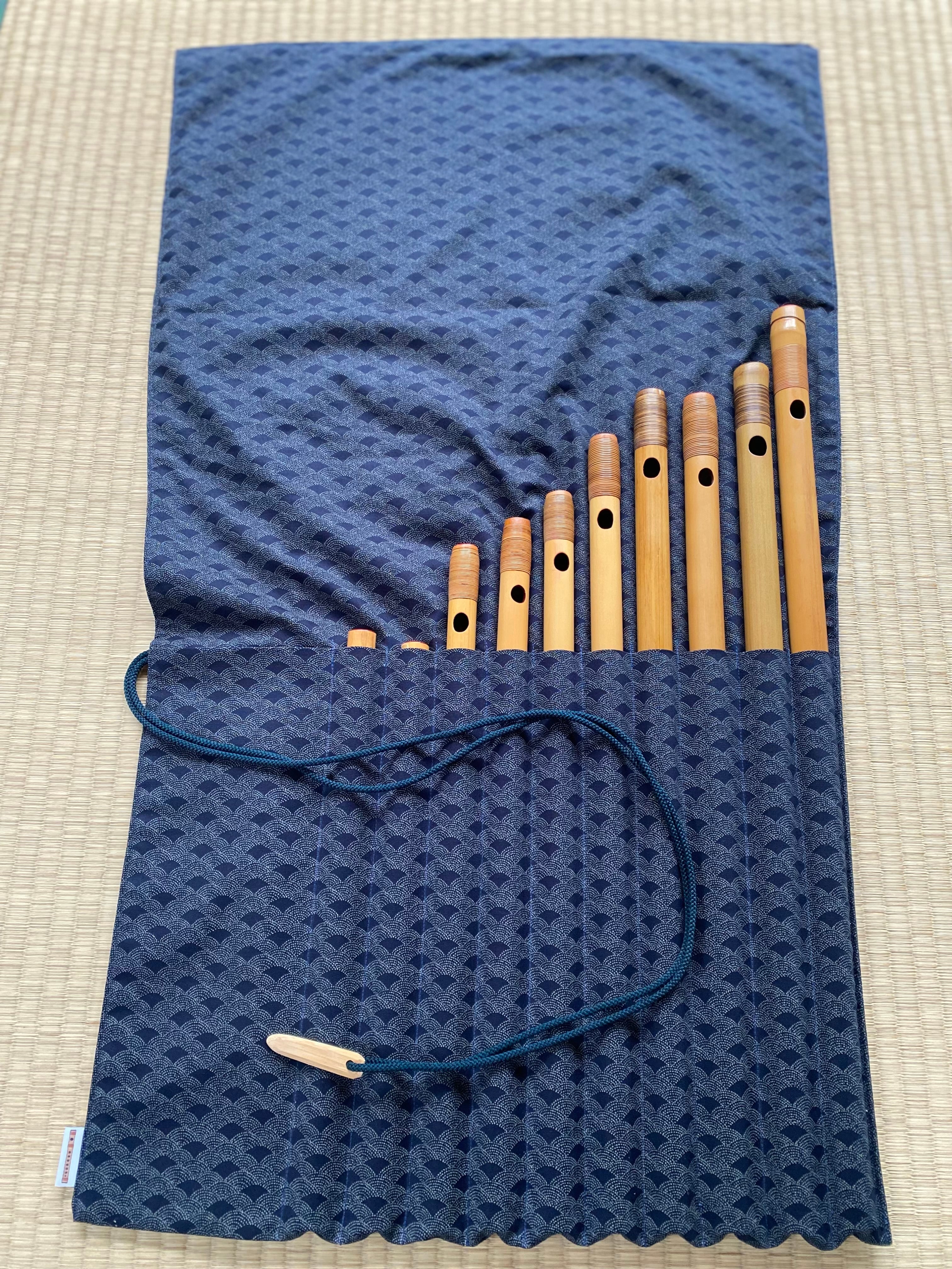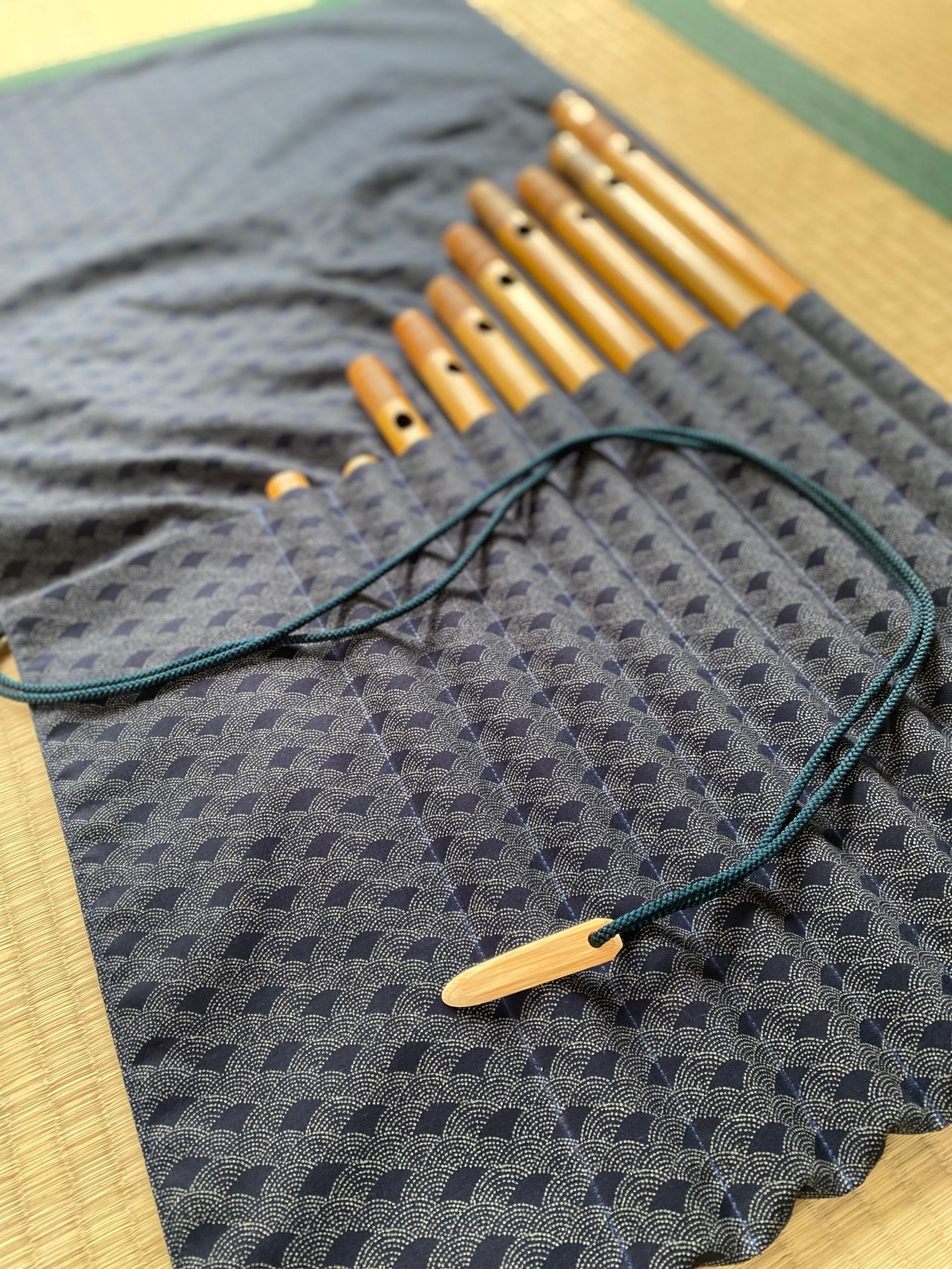 この笛袋の設計は秋吉沙羅が高校生の頃、頭の中にふとひらめいたもので、以来このオリジナルの形を自作で使い続けています。