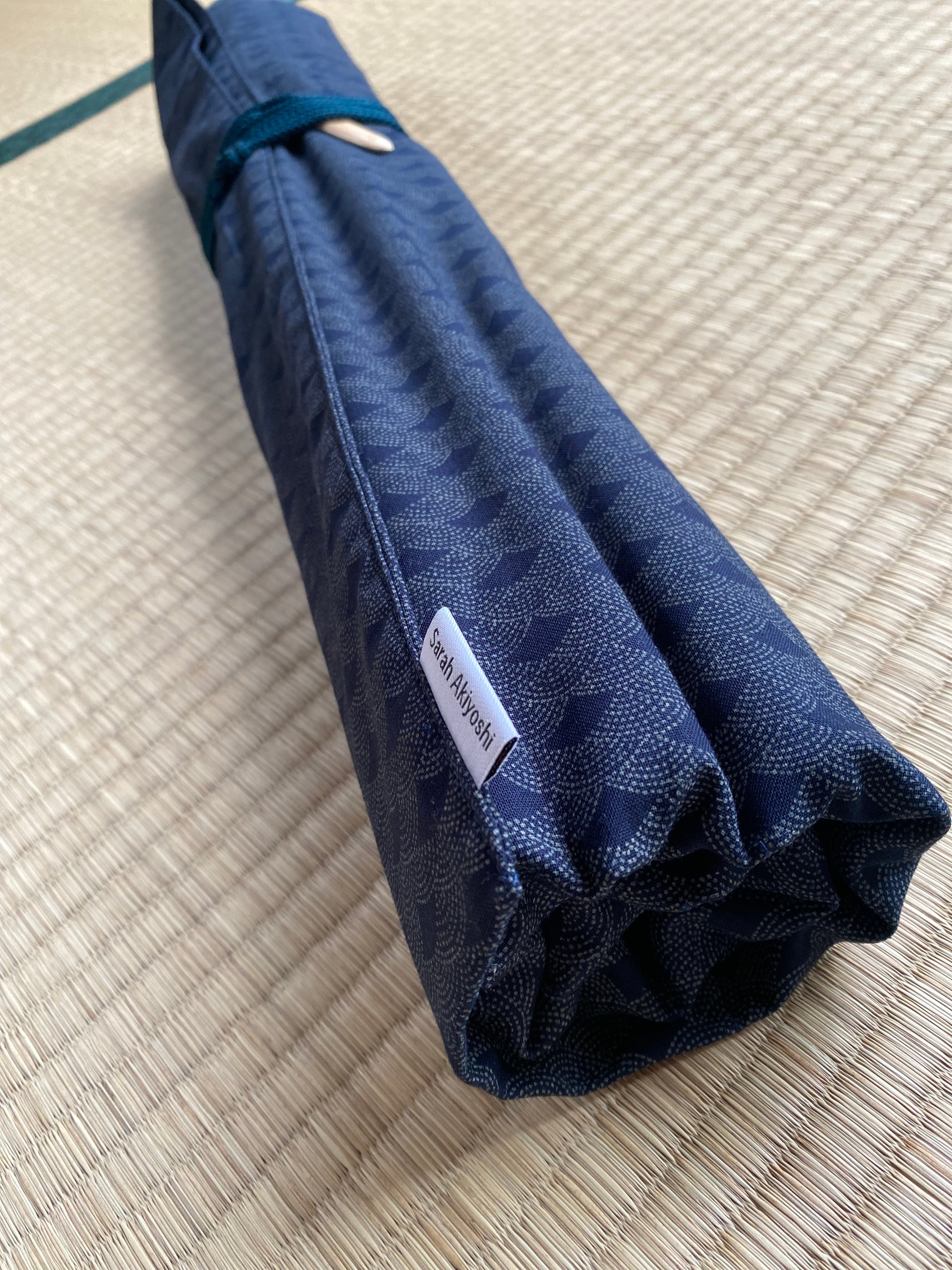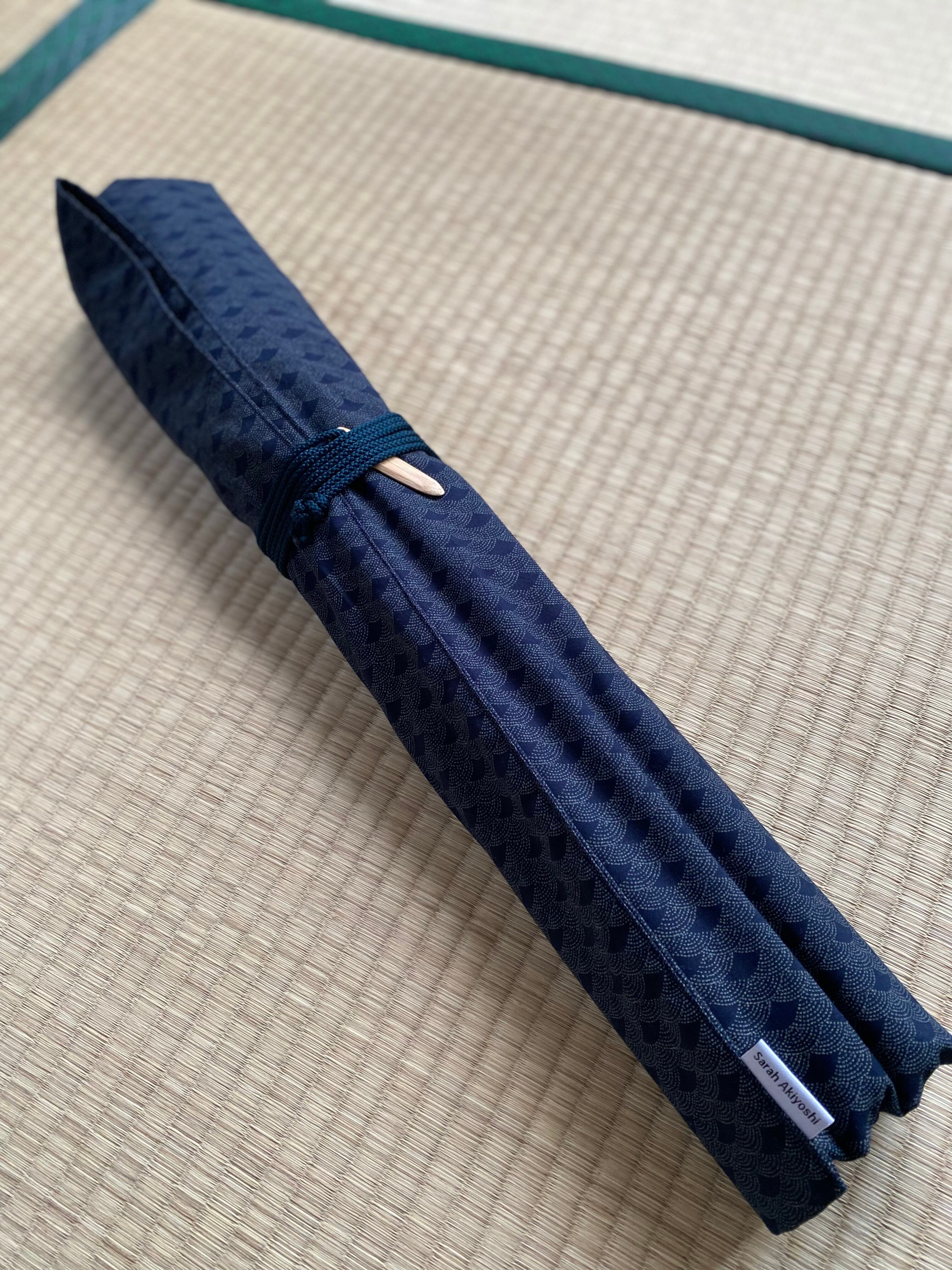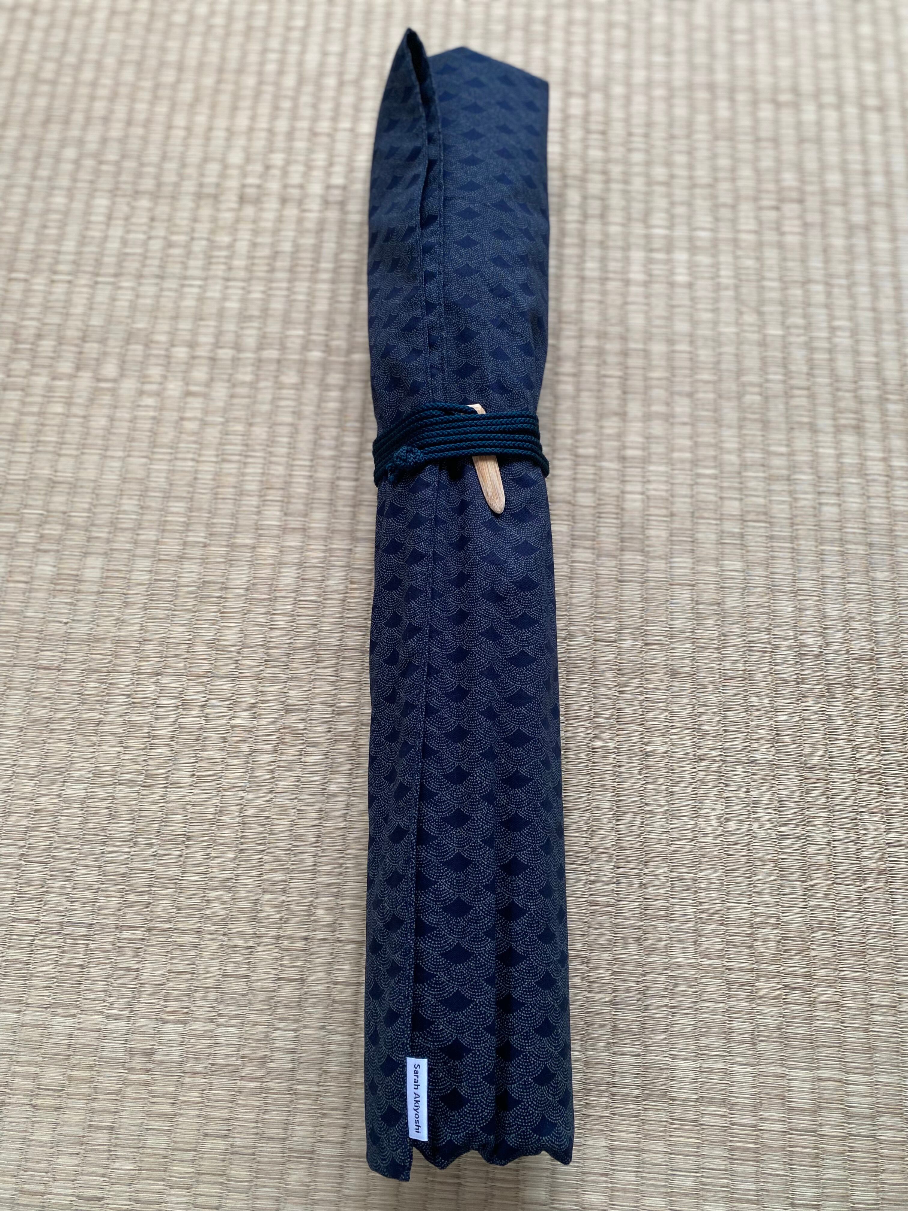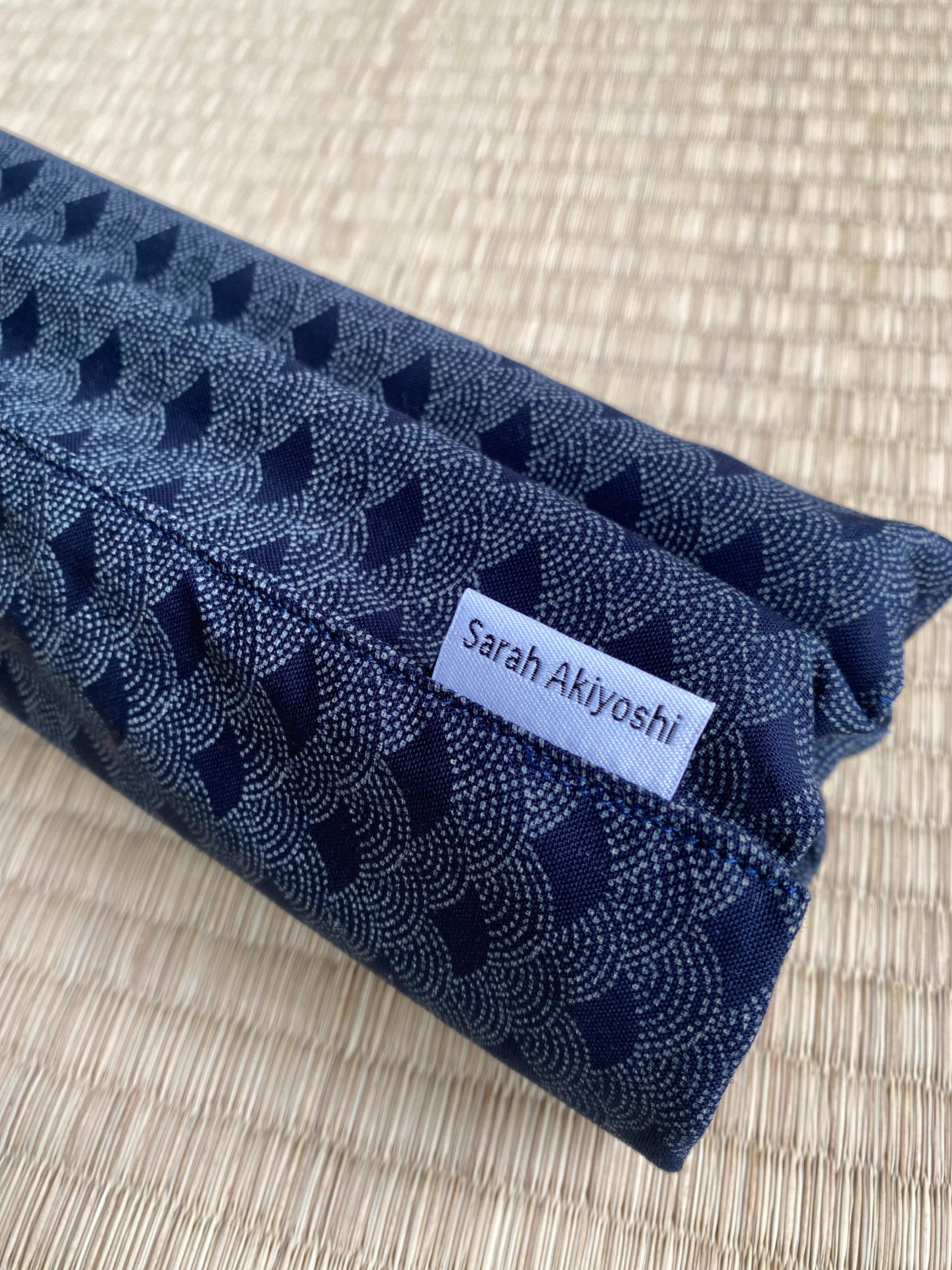 この笛袋の設計は秋吉沙羅が高校生の頃、頭の中にふとひらめいたもので、以来このオリジナルの形を自作で使い続けています。