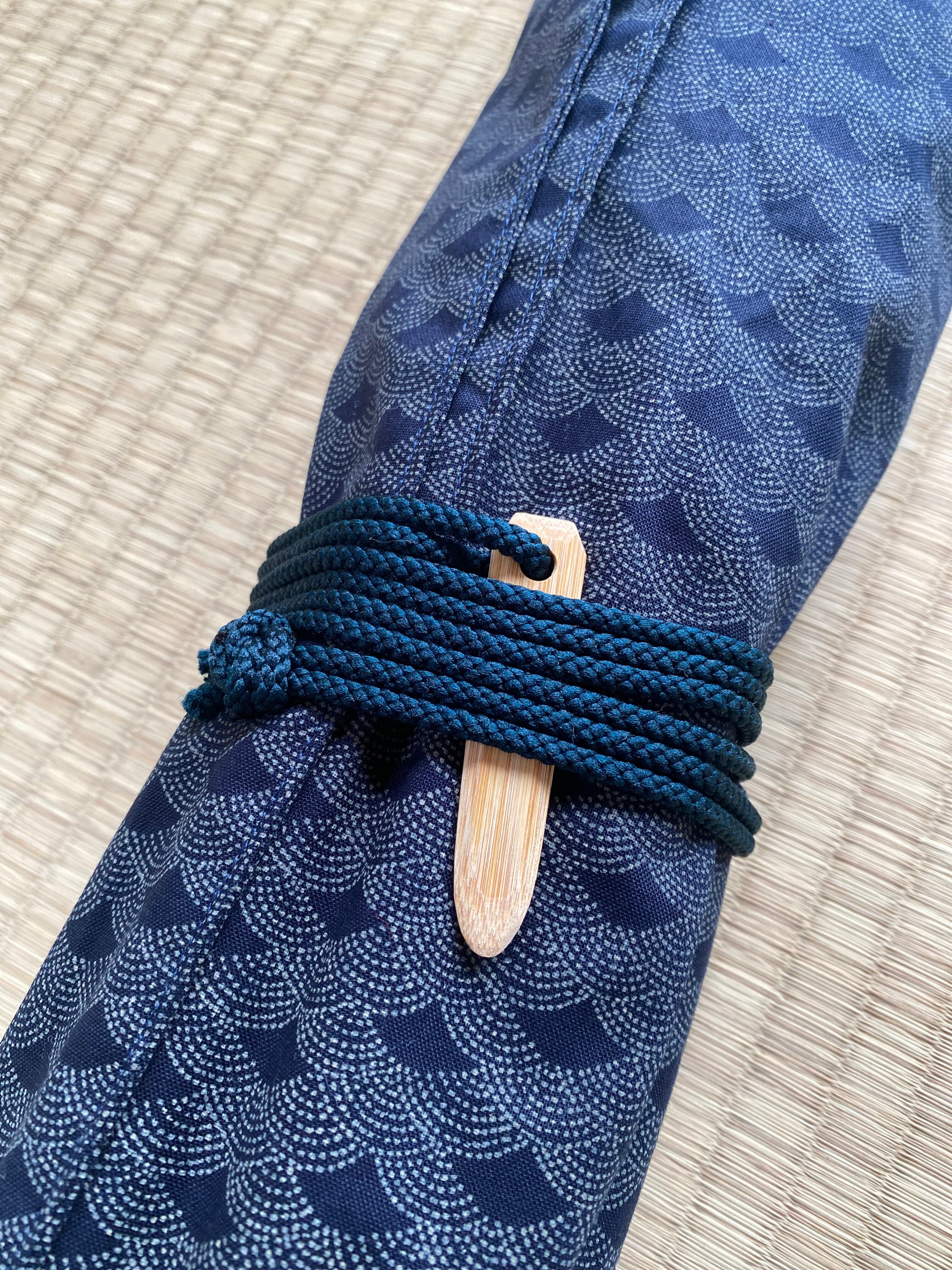 笛袋全体を紐で巻き、笹止めをさして止めます。
